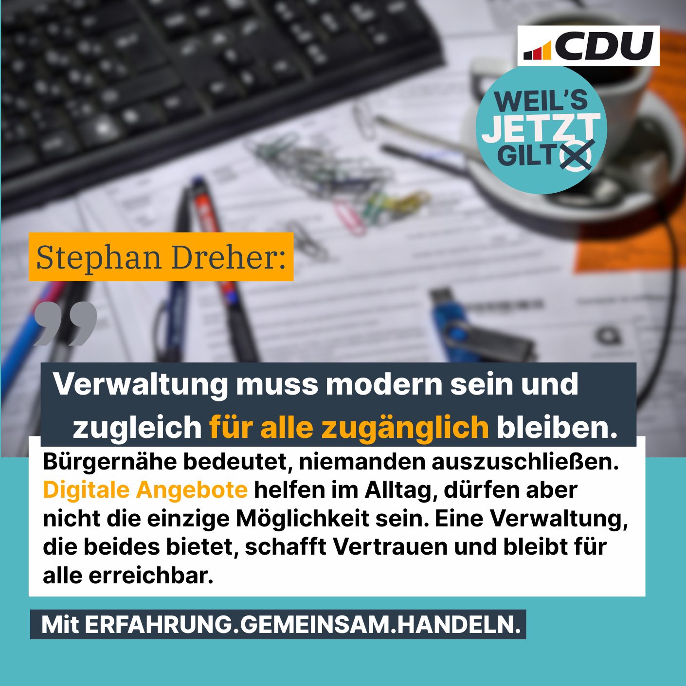 Als Bürgermeister werde ich das öffentliche Gesicht unserer Verwaltung sein. Ich will eine Verwaltung, die transparent, modern und bürgernah arbeitet. Entscheidungen sollen nachvollziehbar, Abläufe effizient und digital sein, und der Verbandsgemeinderat braucht eine souveräne Leitung, die klar, aber ausgewogen entscheidet.